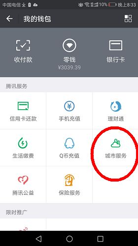 第一步:点开微信右下角》我》钱包》城市服务